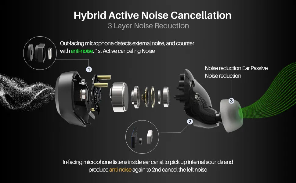 - Noise Cancellation Technology: Hybrid 3-Layer ANC: Outward-facing mic | inward-facing mic, and earcaps work together for effective noise cancellation