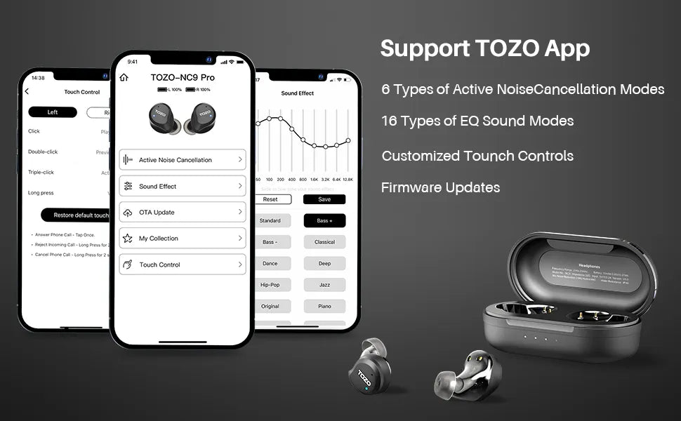 - TOZO App (iOS/Android): Offers customization of noise cancellation settings, EQ, gesture operations, and OTA updates